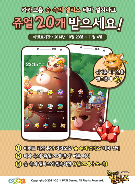 ... 숲속의앨리스 for Kakao의 카카오홈 테마는 구글 플레이 스토어에서 카카오홈 앱을 먼저 다운로드 후 홈 화면의 추천 테마나 구글 플레이 스토어에서 숲속의앨리스 카카오홈 테마를 검색하여 설치할 수 있다. 한편 숲속의앨리스 for Kakao는 지난 10월 21일 정식 출시