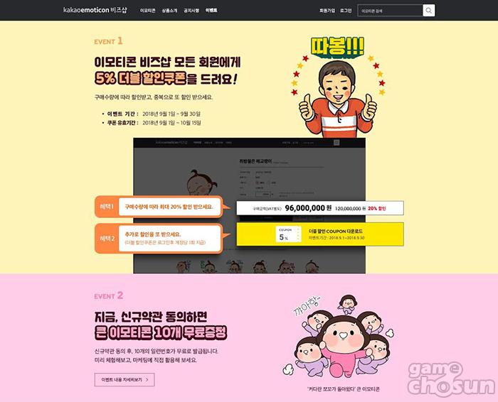 ... 구매 수량에 따라 5%에서 최대 20% 할인을 받을 수 있는데, 1일부터 30일까지 한 달간 이모티콘 비즈샵 모든 회원에게 구매 수량 할인 뿐 아니라 5% 할인 쿠폰을 지급, 더블 할인을 제공한다. 5% 쿠폰은 카카오이모티콘 비즈샵 이벤트 페이지에서 다운로드 배너를 클릭시 받을