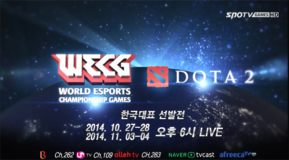 ... 4강 듀얼 토너먼트의 전 경기가 SPOTV GAMES를 통해 생중계 되며, 본선 중계는 김철민 캐스터, 이승원, 정인호 해설위원이 진행 할 예정이다. WECG ‘도타2’ 한국대표 선발전은 대한민국 국적을 보유한 선수로 구성된 팀만이 출전 가능하다. 때문에 국적과는 상관 없이