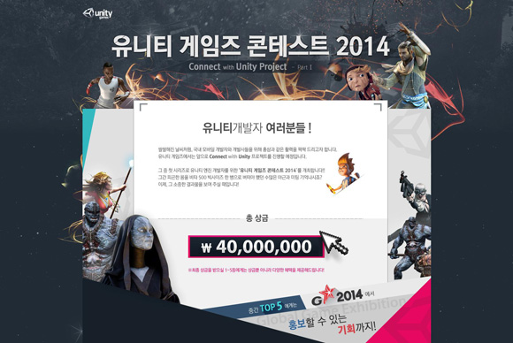 ...com/unitygamescontest2014)을 통해, 10월 22일부터 11월 17일(1차 제출)까지 게임 플레이 영상과 소개 문서를 제출하면 된다. 1,2위 수상작은 각각 3천만원과 1천만원 상당의 개발 지원비가 지원되며 5위까지의 수상작에 한해 웹사이트 홍보, 에셋 스토어