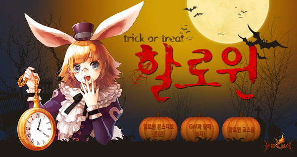... 또한 이벤트 기간 중 곳곳에서 출몰하는 GM을 만나면 특별한 선물을 받을 수 있는 ‘GM과 함께 놀자’ 이벤트가 함께 진행된다. GM이 나타났을 때 ‘장난꾸러기 반지’를 이용해 할로윈 몬스터로 변신하면, ‘최고의 유니크 아이템 티켓’, ‘만능열쇠’등 고급 아이템이 랜덤으로