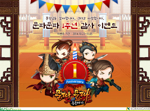 ... 쿤룬코리아는 1년 동안 문파문파에 변함없는 사랑을 보내준 게이머들에게 보답하고자, 금일(22일)부터 11월 5일(수)까지 풍성한 게임 아이템을 제공하는 감사 이벤트를 진행한다. 먼저 손글씨로 문파문파 1주년 축하 메시지를 작성해 이벤트 페이지에 등록하는 모든 게이머에게 제