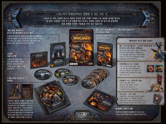 ... 월드 오브 워크래프트: 드레노어의 전쟁군주 한정 소장판 가격은 9만원(권장소비자가)으로 책정되었으며 이에 대한 더 자세한 내용은 월드 오브 워크래프트 공식 홈페이지 블로그를 통해 확인할 수 있다. 드레노어의 전쟁군주 한정 소장판과 관련한 판매 계획 및 일정은 추후 공개될 예정