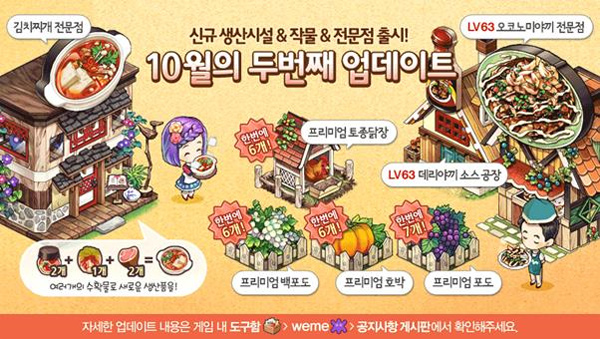 ... 이와 더불어 한 번에 여러 개의 생산품 획득이 가능한 프리미엄 '토종 닭장'과 프리미엄 '포도', '백포도', '호박' 작물 3종이 추가됐다. 또한 '퐁당쇼콜라'와 '로스트 치킨 전문점'을 '영양밥 전문점', '화이트와인 셔벗 전문점', '샹그리아 전문점' 등 총 9종의