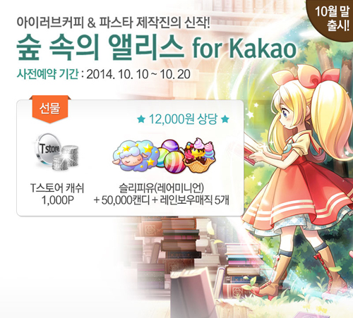 ... 또한 T스토어에서 숲속의앨리스 for Kakao를 다운로드 받으면 T스토어 캐쉬 1000포인트를 추가로 지급하며 게임 아이템을 결제할 경우 해당 금액의 15%(확인요망)를 캐쉬백으로 제공해주기 때문에 유저들은 보다 다양한 혜택을 누릴 수 있다. T스토어 사전예약은 이벤트 페이