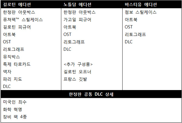 ... 또한 무기와 장비 업그레이드 시스템을 머리, 다리, 팔, 허리, 가슴 등으로 세분화했으며 특성화 시스템을 도입해 플레이 스타일에 따른 전략적 접근이 가능해졌다. 한편, 국내에 발매하는 한정판은 길로틴 에디션, 노틀담 에디션, 바스티유 에디션의 세 종류로 확정됐다.