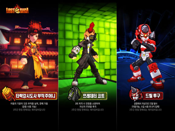 ... 로스트사가는 레어 장비 업데이트를 기념해 특별 패키지를 마련하고, 새롭게 선보이는 ‘코스튬 변경’과 관련한 이벤트를 진행한다. ‘코스튬 변경’은 자신이 착용한 장비를 다른 장비 이미지로 변화시킬 수 있어, 상대에게 자신이 보유한 능력이 무엇인지 감추어 보다 전략적인 전투