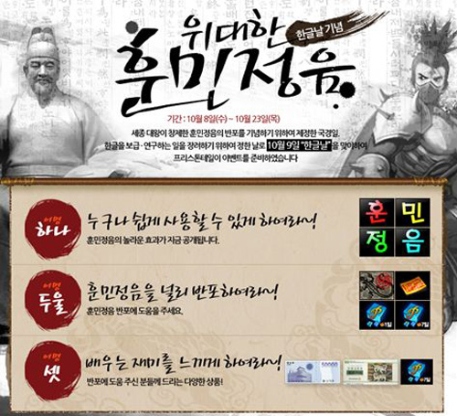 ... 또한 이벤트 기간 동안 획득한 “훈”, “민”, “정”, “음” 4가지 아이템을 모아 게임 내 리카르텐 마을에 있는 ‘퍼즐 수집가 라몬트’ NPC에게 가져다 주면 리자드 티켓, 고스트 티켓 및 프리미엄 서비스 1일, 7일권 중 한 가지 아이템과 교환할 수 있다. 이와 함께