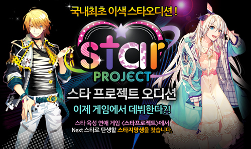 ... 스타프로젝트 오디션의 서류전형 및 예선, 본선을 통해 진행되며 가수 부문과 곡 부문을 모집하고 있다. 최종 합격자는 게임 스타프로젝트에 국내 정상급 일러스트레이터의 작업을 통해 주, 조연급 캐릭터로 노출되며 전속 연예계약사의 전문 트레이닝 기회 부여 및 전속가수 계약기회가