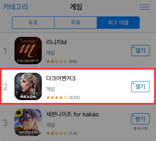 ...최상위권은 ‘리니지M’과 ‘리니지2레볼루션’ ‘소녀전선’으로 지난주와 동일하다. 이어 ‘세븐나이츠’가 4계단을 올려 5위권에 진입했다. ‘프리스타일2플라잉덩크’가 지속적인 상승세를 보여주고 있으며 ‘레이튼미스터리저니’가 유료게임으로는 유일하게 이름을 올렸다