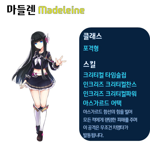 ...이번 업데이트를 통해 적에게 무작위로 ‘치명타’ 피해를 주는 포격형 신규 픽시 ‘마들렌’과 ‘마들렌’의 선호 슈트 ‘이졸데’를 SSS등급부터 US+2급까지 등급별로 추가했다. ‘마들렌’은 ‘아스가르드 어택’ 각성 스킬과 ‘콜래트럴 스파크’ 및 ‘미사일 샤워’ 선호 슈트 스킬을 보유