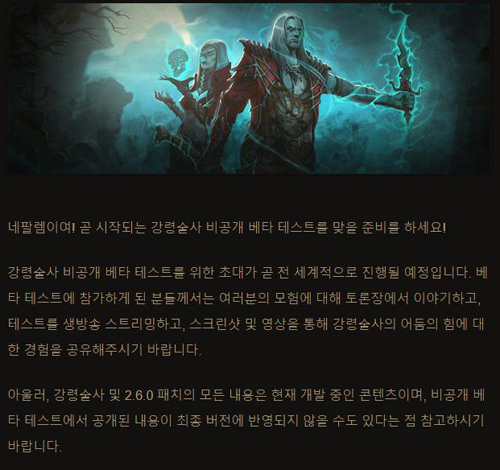 ... 그는 자신이 쓰러뜨린 적의 피와 뼈의 힘으로 싸우며 적에게 저주를 걸고 그들의 시체를 되살리거나 폭발시킨다. 강령술사는 디아블로2 이용자들에게 공포의 스킬로 불렸던 시체폭발(시폭)까지 구현될 예정이다. 테스트 참가는 블리자드 계정 관리의 '베타 테스트 신청/관리 페이지