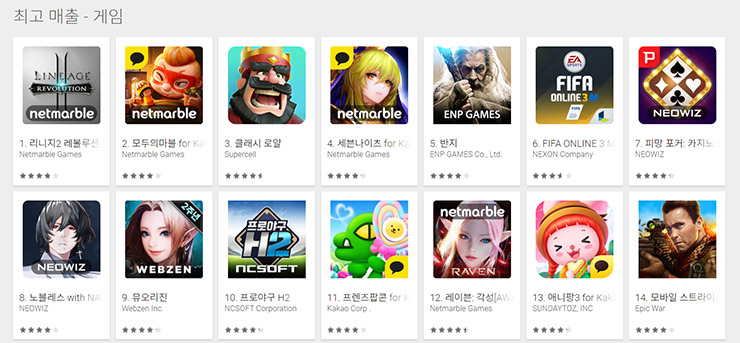 ... 기존 RPG 전성시대 당시 70%이상의 점유율을 차지한 것에 비해 전략, 스포츠, 보드게임 등의 장르 약진이 두드러지는 것. 이 가운데 '모두의마블'은 상위권에 고정된 상태고 특정 시기마다 '피파온라인3M'과 '피망포커'의 급상승을 보이고 있고 엔씨소프트의 신작 '프로야