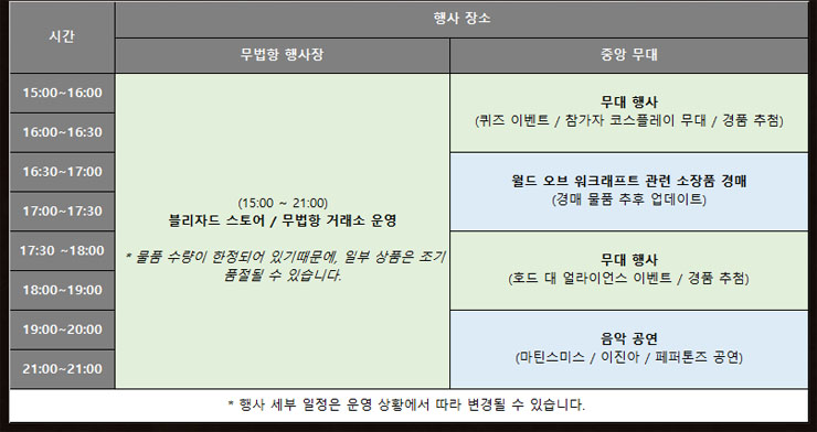 ... 행사에서는 16시 30분부터 자선 경매가 진행된다. 경매에는 와우 오리지널 북미 소장판과 개발자 사인이 담긴 와우:군단 소장판, 와우:리치왕의분노 북미 소장판, 게임 내 아이템인 멀룩 코스튬, 와우 영화에 등장했던 로서의 검과 레인왕의 검 등이 판매되고 자선 경매 수익금 전