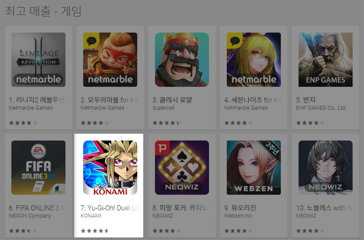 ... '유희왕 듀얼링크스'가 구글 매출 최고 순위를 경신했다. 일본 코나미가 지난 4월 12일 국내 서비스를 시작한 모바일 카드게임 '유희왕 듀얼링크스(Yu-Gi-Oh! Duel Links)'가 20일 구글플레이 게임부문 최고 매출 순위에서 7위를 기록하며 전날 역대 최고