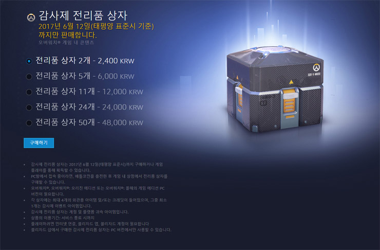... 전리품 상자는 게임 플레이를 통해 획득하거나 구매할 수 있으며 24일부터 내달 13일 게임에 처음 접속할 때 1개를 무료로 얻을 수도 있다. 또한 이벤트 기간이 종료되면 해당 상자 및 아이템은 획득할 수 없다. △ 감사제 리품 상자는 게임 플레이를 통해 획득하거