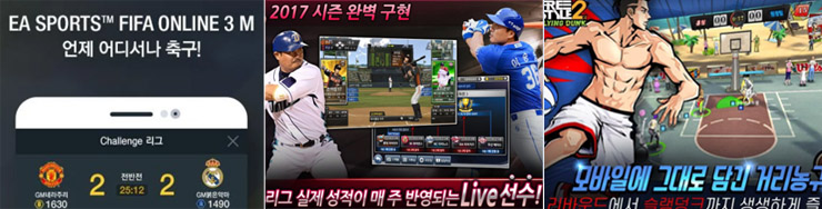 ... 매달 초 순위 급상승을 보이는 피파온라인3M(11위)를 시작으로 농구게임 프리스타일2:플라잉덩크(12위), 엔씨소프트의 프로야구H2(19위), 컴투스프로야구2017(27위) 등 4종의 게임이 서비스되고 있다. 이는 PC온라인게임 시절 숱한 RPG의 인기에도 피파온