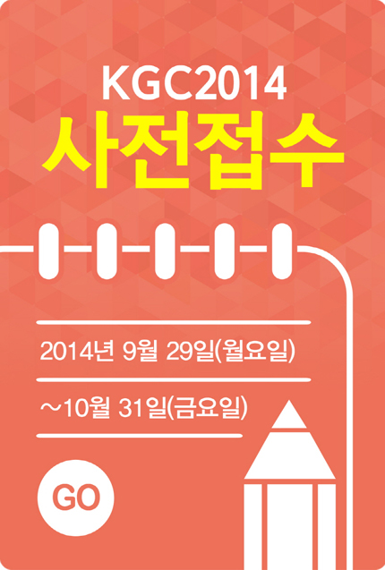 ...com)를 통해 사전 등록한 이용자는 최대 50% 이상 할인된 가격으로 'KGC2014'의 각종 강연을 만나볼 수 있다. 단체(5인 이상) 등록자와 게임관련학과 및 일반 학생(중, 고, 대학생)에게는 추가 할인 혜택이 제공되며, 모든 사전 등록자는 각종 행사 기념품과 함께 경품
