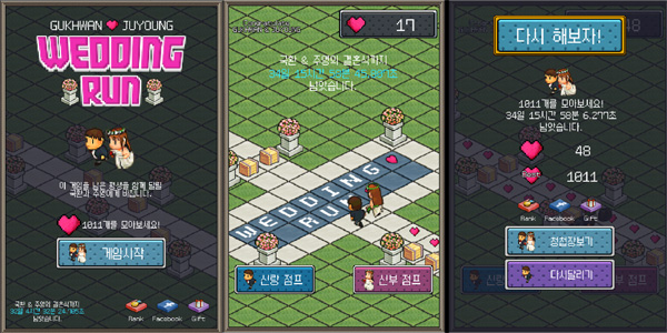 ... '웨딩런'을 받아 게임을 시작하면 결혼식까지 남아있는 날짜를 무려 초단위로 보여주며 결혼식에 대한 압박감을 주기 시작한다. 게임의 룰은 장애물인 박스를 피하거나 부수고 하트를 획득하기만 하면 되는 정말 간단한 보편적인 러닝게임의 룰이지만 신랑과 신부를 각자 컨트롤해야 한다는