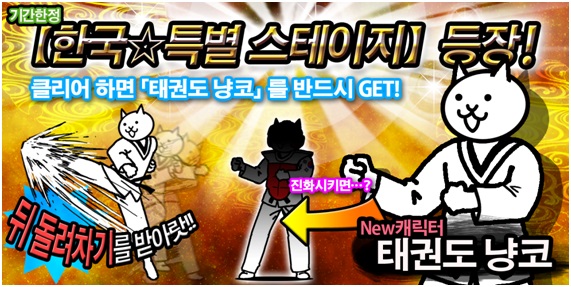 ... 포노스는 300만 다운로드 달성을 기념하고 유저에 대한 감사와 보답의 의미로 국내 버전에만 등장하는 스테이지를 클리어 할 경우 태권도 냥코를 지급하는 특별 이벤트를 진행한다. 한국적이면서도 강한 캐릭터를 상징하는 태권도 냥코는 한국 고유 무예인 태권도를 소재로 도복을 입고