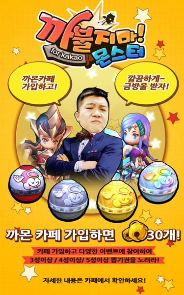 ... 또한 컬렉션의 묘미가 더해진 300여명의 영웅과 PVP를 통해서만 획득이 가능한 블랙영웅은 육성의 재미와 수집욕을 동시에 자극할 것으로 기대된다. 까불지마몬스터 for Kakao 출시를 기념한 이벤트도 다채롭게 진행된다. 양배추 조세호의 카카오톡 이모티콘 증정 이벤트부