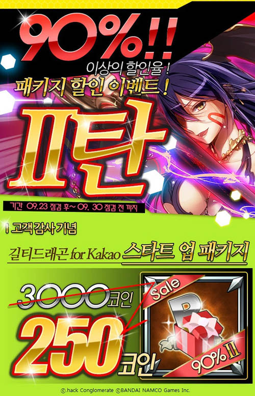 ... 이에 따라 길티드래곤 for Kakao 스타트 업 패키지를 90% 이상 할인된 가격에 구입할 수 있다. 해당 패키지 구성물은 13회 프리미엄 소환 티켓, 1만 골드, 5천 AP로 3,000코인 이상의 상품을 250코인에 구입할 수 있다. 길티드래곤 for Kakao의