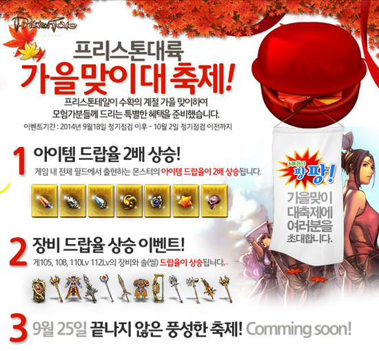 ... 먼저, 이벤트 기간 동안 게임 내 모든 필드에서 출현하는 몬스터의 아이템 드랍율이 2배 상승한다. 이와 함께 105, 108, 110, 112 레벨의 장비 아이템 및 일반 아이템의 드랍율도 일정부분 상승해 평소 획득하기 어려웠던 아이템을 만날 수 있는 기회가 제공된다. 또