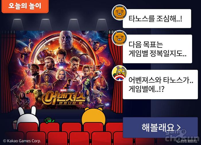 ...카카오게임즈는 ‘게임별 스낵톡 어벤져스: 인피니티워 편’에 참여하는 이용자들에게 희귀 마블 아이템을 증정하는 이벤트를 진행한다. 스낵톡 내에서 퀴즈 정답을 맞히고 미션 수행에 성공한 이용자들에게는 추첨을 통해 오는 25일 개봉하는 ‘어벤져스: 인피니티워’ 예매권과 ‘어벤져스 티셔