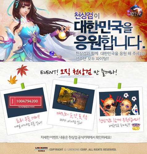 ... 이와 더불어 천상검은 오는 24일(수)까지 가을 느낌이 물씬 나는 게임 배경을 바탕으로 캐릭터의 모습을 스크린샷하여 게시글을 등록하는 유저에게 아이언맨 USB, 록시땅 핸드크림, 500루비 등 풍성한 선물을 증정하며 오는 19일(금)까지 매일 저녁 7시 1만 원 상당의 아이템
