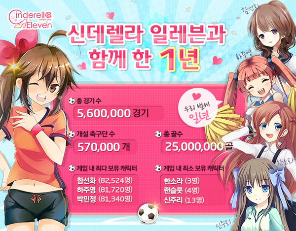 ... 17일까지 유저 사진전시회를 온라인으로 개최해 ‘신데렐라 일레븐’과의 추억을 공유할 예정이다. 사진전시회에 당선작으로 선정된 유저에게는 특별 제작 텀블러, 캐릭터 USB 메모리 등이 상품으로 주어진다. 또 커뮤니티 사이트에 응원 및 축하글을 남기거나 팬아트를 만들어 게시하