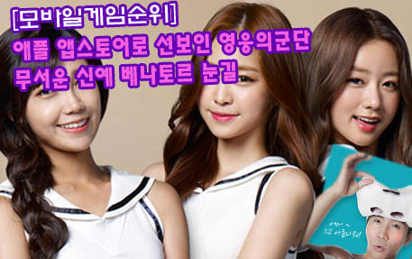 ... 9월 2주(2014년 9월 1일 ~ 2014년 9월 7일) 게임조선 모바일게임 순위입니다. 9월 2주 모바일게임순위는지난 주와 마찬가지로 신작 게임이 강세를 보인 한 주이다. 금주는 ‘영웅의군단 forKakao’가 새로운 홍보모델 ‘에이핑크’와 애플 앱스토어 출시