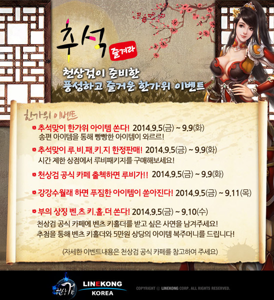 ... 천상검은 9월 5일(금)부터 10일(수)까지 공식 카페를 통해 선물을 받고 싶은 사연을 남기는 유저들 중 추첨을 통해 10명에게 벤츠 키홀더와 5만 원 상당의 아이템 복주머니를 증정하는 이벤트를 진행한다. 또한 게임에 접속하여 파티 던전을 진행한 후 BOSS를 처치하는 유