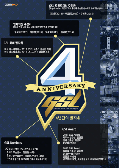 ... 준우승을 가장 많이 한 선수는 이정훈(MVP_MarineKing)과 어윤수((SK Telecom T1_soO)로 각각 3회의 준우승 기록을 갖고 있다. 어윤수 선수는 3회 연속으로 결승전에 진출해 결승전 연속 진출 최고기록도 보유하고 있다. 지난 4년 동안 GSL에서