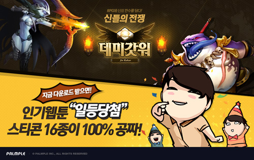 ... 일등당첨은 복권당첨이라는 누구나 꿈꿀 법한 흥미로운 소재를 다룬 웹툰으로, 네이버 웹툰 평균 평점 9. 9점을 넘는 등 큰 인기를 얻고 있다. 선물로 제공되는 스티콘은 데미갓워를 위해 특별 제작된 한정판으로, 작가 미티의 그림 스타일을 카카오톡에서도 즐길 수 있다