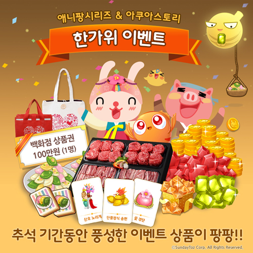 ... 친구에게 도움티켓으로 점수를 준 이용자는 자동으로 도움왕에 응모되며 도움왕에 선정된 100명에게 토파즈 50개가 증정된다. 또한 애니팡 사천성에도 오는 6일부터 송편 모아 소원 빌기 이벤트를 진행한다. 게임 속 송편 패를 모으고 친구에게 딸기를 보내면 이벤트에 1회 응모 수