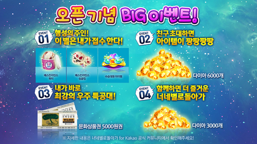 ... 영상에는 웹툰의 주인공들이 야구를 하다가 우연히 외계인 우주선을 맞추고, 콜라와 민트 사탕을 이용해 우주선을 수리한 후 함께 우주로 떠난다는 황당하면서도 재미있는 스토리를 담고 있다. 한편 너네별로돌아가 for Kakao는 출시를 기념하여 풍성한 경품 이벤트도 실시한다.