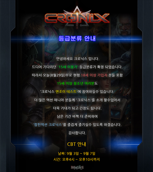 ... 때문에 크로닉스는 기존 '18세 이용가'에서 '15세 이용가'로 참여가 확대됐다. 이번에 변경된 '15세 이용가'는 내달 3일에 진행될 1차 CBT 때 부터 적용될 예정이다. 매직스에서 개발한 크로닉스’는 언리얼엔진3로 제작된 온라인 TPS 액션 게임으로 다양한 능
