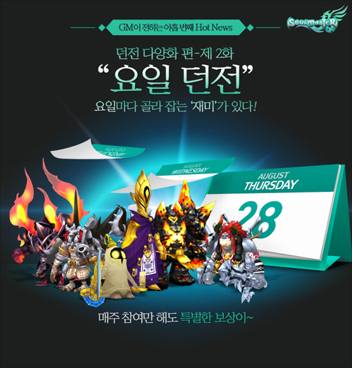... 이번 GM노트에는 새롭게 개발 중인 신규 시스템 ‘요일 던전’에 관한 내용과 이를 기념하는 이벤트 소식이 담겨있다. ‘요일 던전’은 매 요일마다 새로운 몬스터가 등장하는 던전 시스템으로, 해당 요일에 던전이 오픈되면 누구나 자유롭게 입장이 가능하다. 특히 레벨 구간에 따라