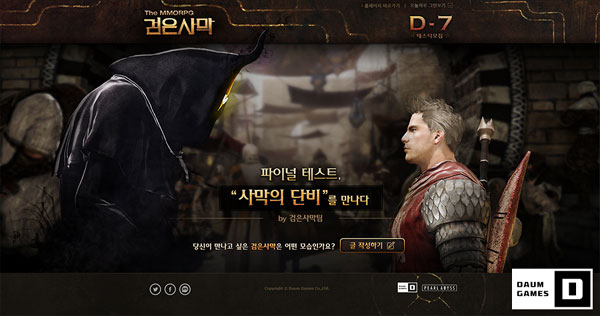 ... 유저들이 남겨준 댓글 가운데 선정된 내용은 티저 사이트 메인에 게시될 예정이다. ‘검은사막’의 파이널 테스터 모집은 오는 9월 2일부터 11일까지 진행되며, 다음(Daum) 아이디를 가진 회원은 누구나 신청할 수 있다. ‘검은사막’은 지금까지 CBT를 두 차례 치른 바