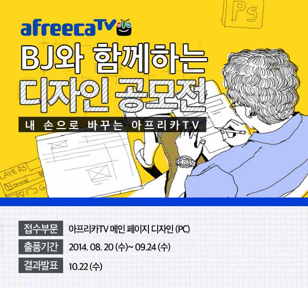 ... 해당 디자인 공모전은 아프리카TV 이용자라면 누구나 참여할 수 있다. 다음달 24일까지 자신이 구상한 아프리카TV 홈페이지 메인을 이미지 파일, PPT, 텍스트, 동영상 등 자유로운 형식으로 표현해 이벤트 페이지(2014design-contest. afreeca