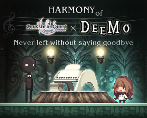 ... <크루세이더퀘스트>와의 콜라보 업데이트에서는 DEEMO에 수록된 오리지널 곡 4곡이 배경음악으로 등장하는 던전 4개층이 36일 동안 기간 한정으로 등장한다. 이는 <크루세이더퀘스트> 최초의 리듬게임 형태의 던전이며, DEEMO에서 곡을 플레이