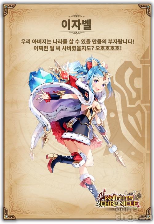 ... 빛속성 복합형 캐릭터 '이자벨' = 나이츠크로니클 공식 카페 이자벨의 특징은 높은 반격 확률에 있다. 60레벨 특성을 획득하면 웨이브 시작 시 황금 자루 1개를 획득하며, 황금 자루가 1개라도 있다면 반격 확률이 75% 증가한다. 단순 반격 확률이 높다면 별 의미