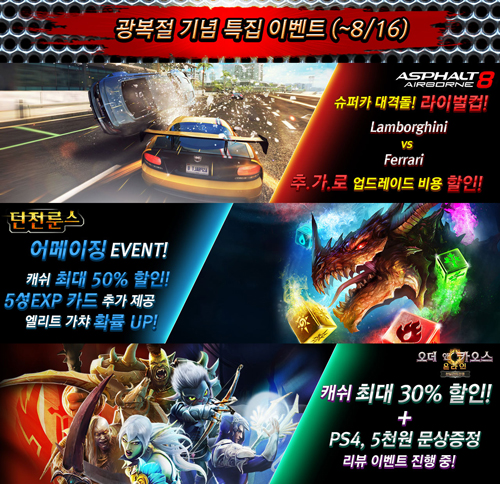 ...이어 아케이드 레이싱 게임 아스팔트8:에어본(이하 아스팔트8)은 광복절 전날인 8월 14일부터 16일까지 3일간 람보르기니와 페라리의 불꽃튀는 라이벌전이라는 이벤트를 진행한다. 알프스와 도쿄 트랙을 배경으로 각 레이스에서 요구하는 조건을 달성하면 획득할 수 있는 트로피를 많이 모을
