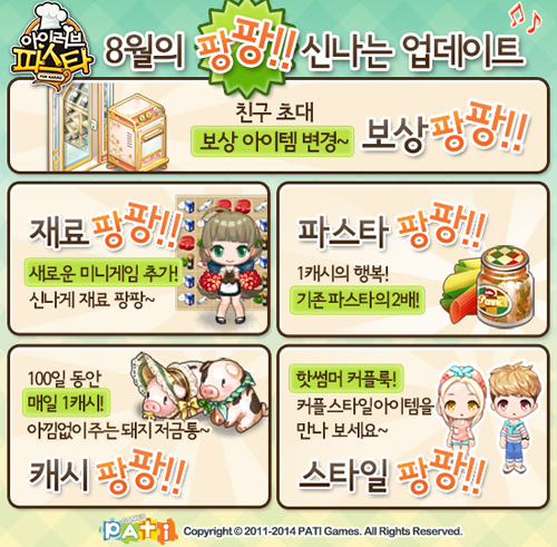 ...먼저 게임 속에 구비된 미니게임에 재료팡팡 게임을 추가한다. 재료팡팡은 목표로 설정된 재료를 제한시간내에 3줄 이상 맞추는 간단한 게임으로 신규 오븐요리를 획득하거나 단골 손님 및 VIP 주문 받기 시 서빙게임을 선택해 즐길 수 있다. 이어서 신규 아이템인 돼지 저금통을 출시하고