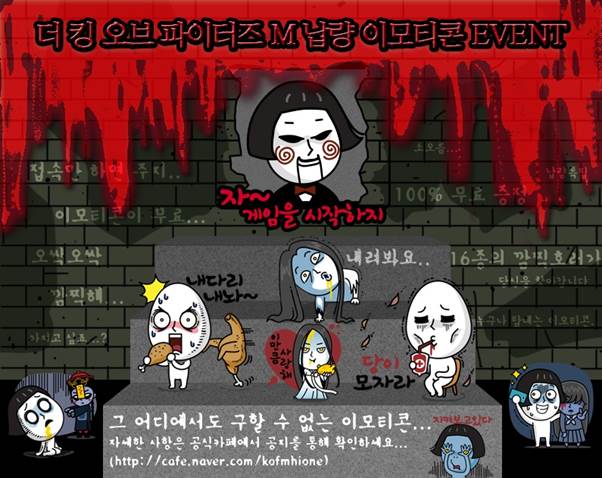 ... 이번 이모티콘은 오싹하면서도 귀여운 모습의 호러 캐릭터 16종으로 구성됐다. 이벤트는 오는 25일까지 진행되며, 기간 내에 KOF M for Kakao를 내려 받은 신규 이용자들은 누구나 참가할 수 있다. [이동수 기자 ssrw@chosun