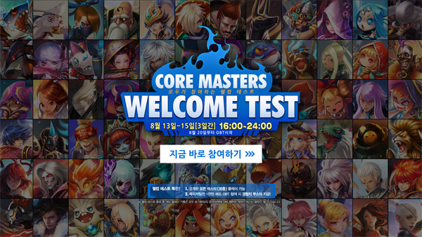 ... 또한 웰컴테스트 기간 동안 35종의 마스터들을 로테이션 없이 모두 사용할 수 있고 테스트 마지막 날인 8월 15일 광복절을 기념하여 맵 곳곳에 태극기가 게양되는 특별 맵도 공개할 예정이다. ‘코어마스터즈’는 무한 역전이 가능할 정도로 빠른 전투와 통쾌한 액션이 특징인 게임