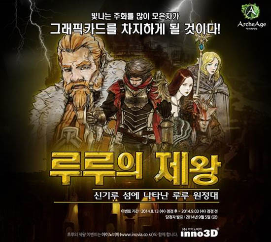 ... 루루 원정대의 빛나는 주화 50개를 모으면 inno3D 지포스 GTX750Ti 그래픽 카드를, 40개 이상 모으면 아이노비아 Hercules HMK-1100 Combo를 획득할 수 있는 자동 응모기회가 주어진다. 주화를 30개 이상 모은 전원에게는 200골드를 주고 각 서버