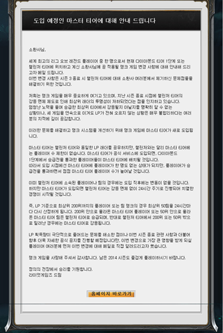 ... 공식 도입이 될 경우 다이아몬드 1단계에서 승급전을 통과한 유저들은 챌린저가 아닌 마스터 티어에 배치를 받게 된다. 기존의 챌린저 티어에 속해있던 유저나 팀의 경우에는 도입 당일에는 그대로 챌린저에 속하나 다음 날 부터는 마스터 티어 플레이어와 마스터 티어 팀과 경쟁을 펼쳐