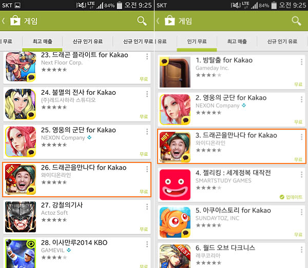 ... 인기 무료 순위도 방탈출과 영웅의군단에 이은 3위를 달리고 있다. ▲ 2014년 8월 9일 구글플레이 마켓 인기차트 이와 같은 순위 상승은 PC온라인에서 즐기던 실시간 RPG의 재미를 모바일에 그대로 담은 게임성과 입소문 영향으로 분석된다. 드래곤을만나다는 개발