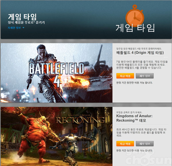 ... 이번 '게임타임'을 통해 '배틀필드4'를 구입하지 않은 유저들은 7일간 정식 버전과 동일한 기능을 사용할 수 있다. 계정 정보는 저장되며 무료 기간이 끝난 뒤 게임을 구입하면 이전의 데이터를 그대로 사용할 수 있다. 이번 '게임타임'에서는 배틀필드4외에도 액션 R